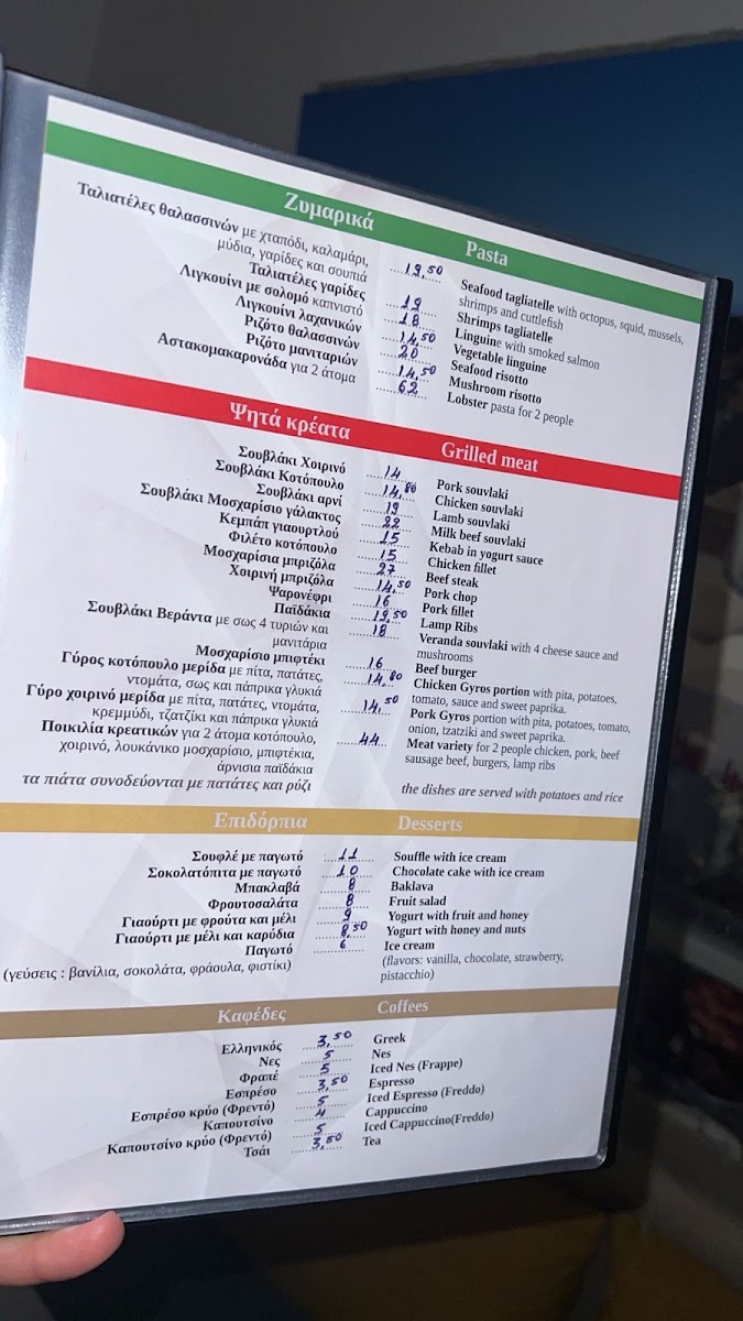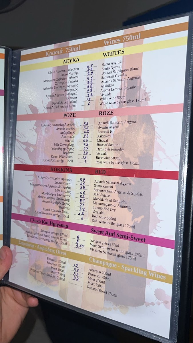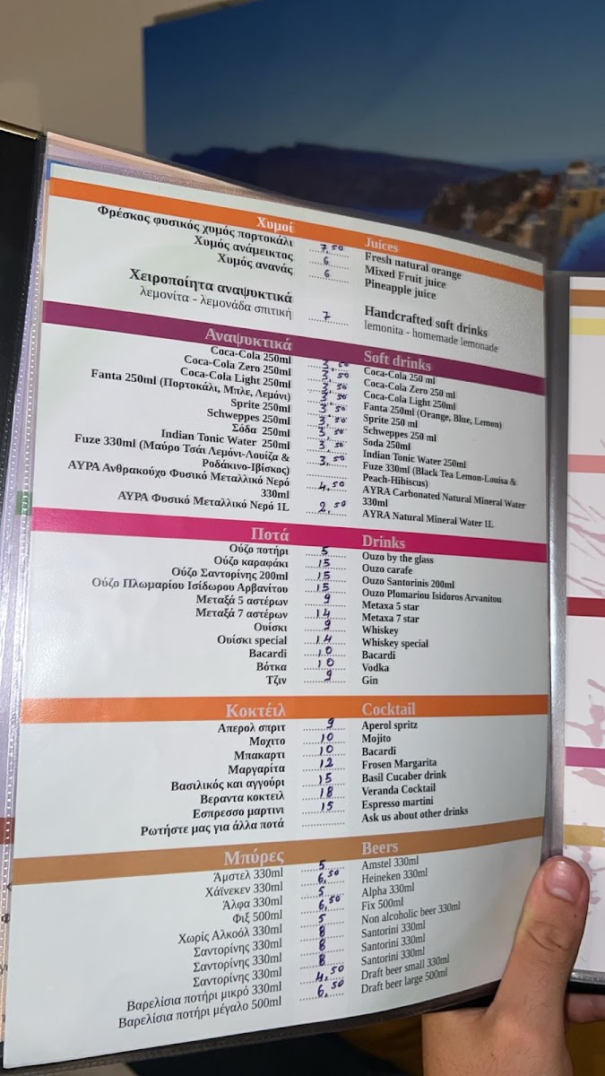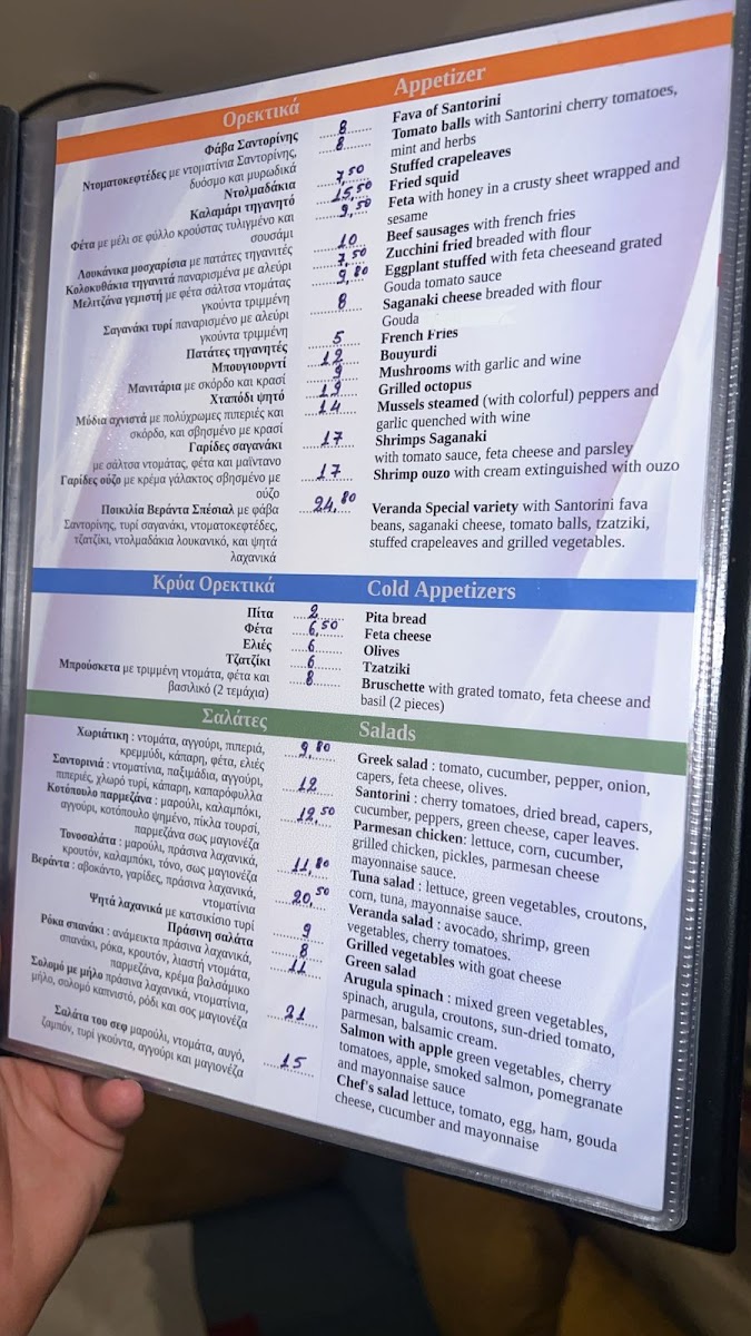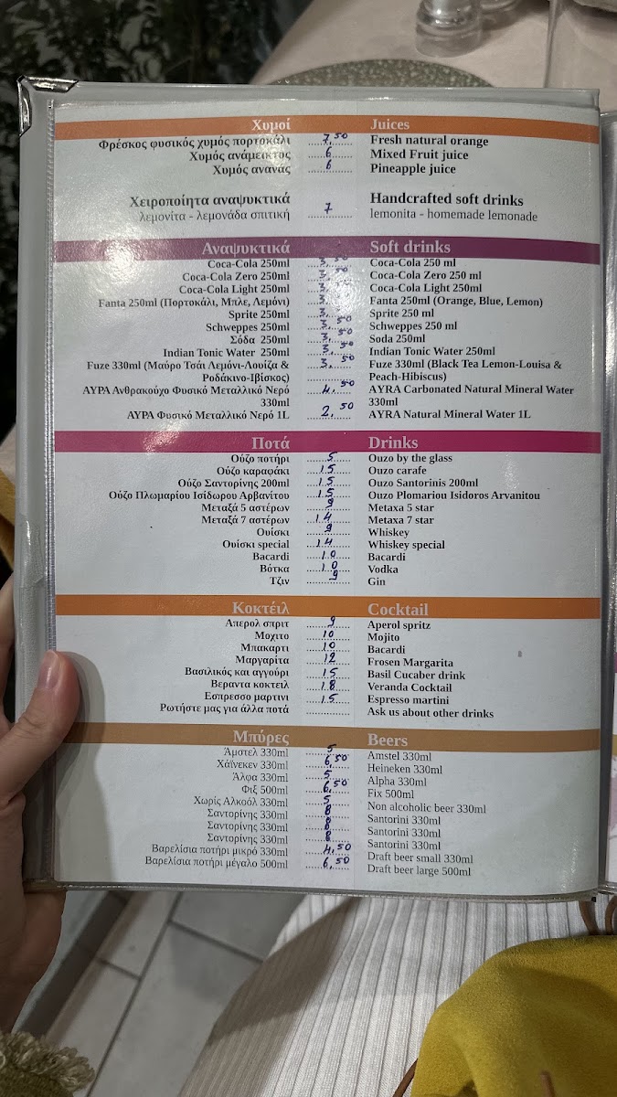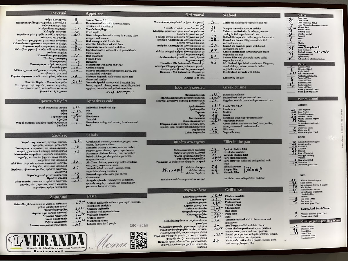 Guests can expect a variety of fresh, simple flavors that complement the open-air setting and scenic views of Thira. The menu features classic starters like tzatziki and Greek salad, alongside heartier options such as Veranda chicken fillet and seafood risotto. These dishes fit naturally in a setting where meals are savored casually, whether gathered with family or friends.